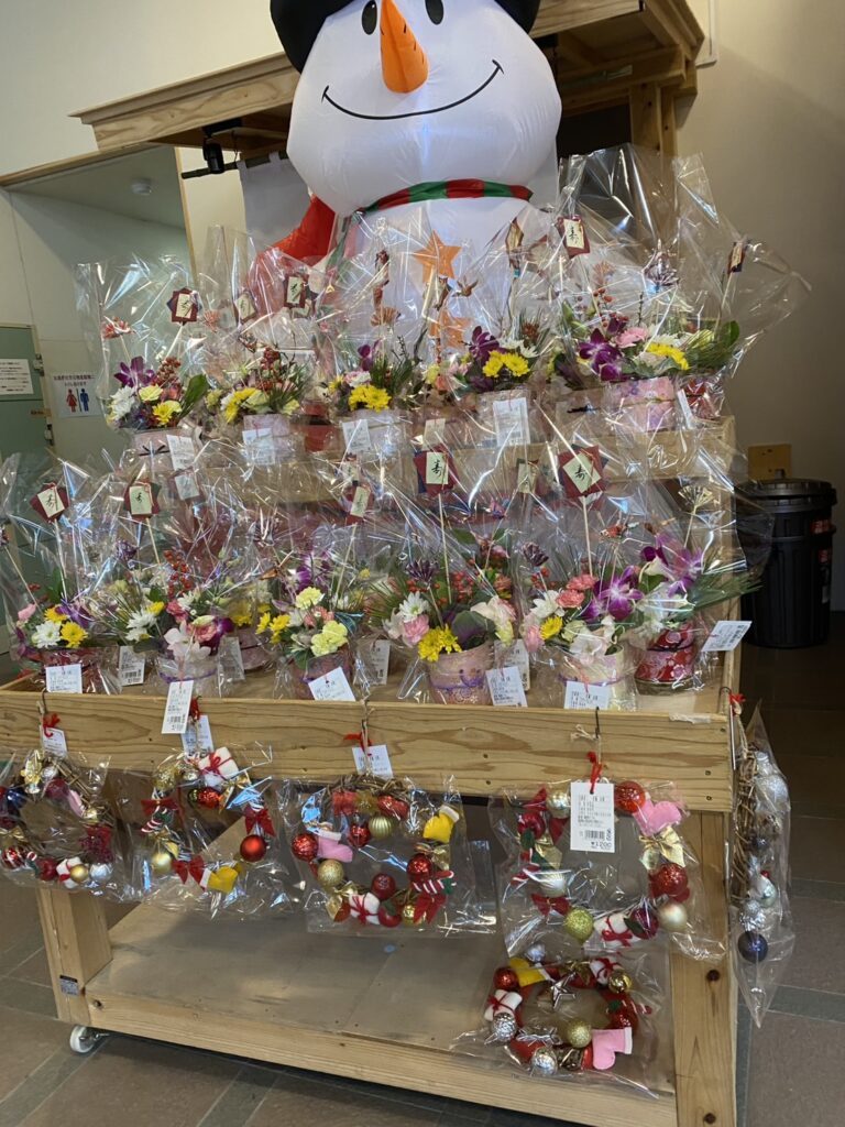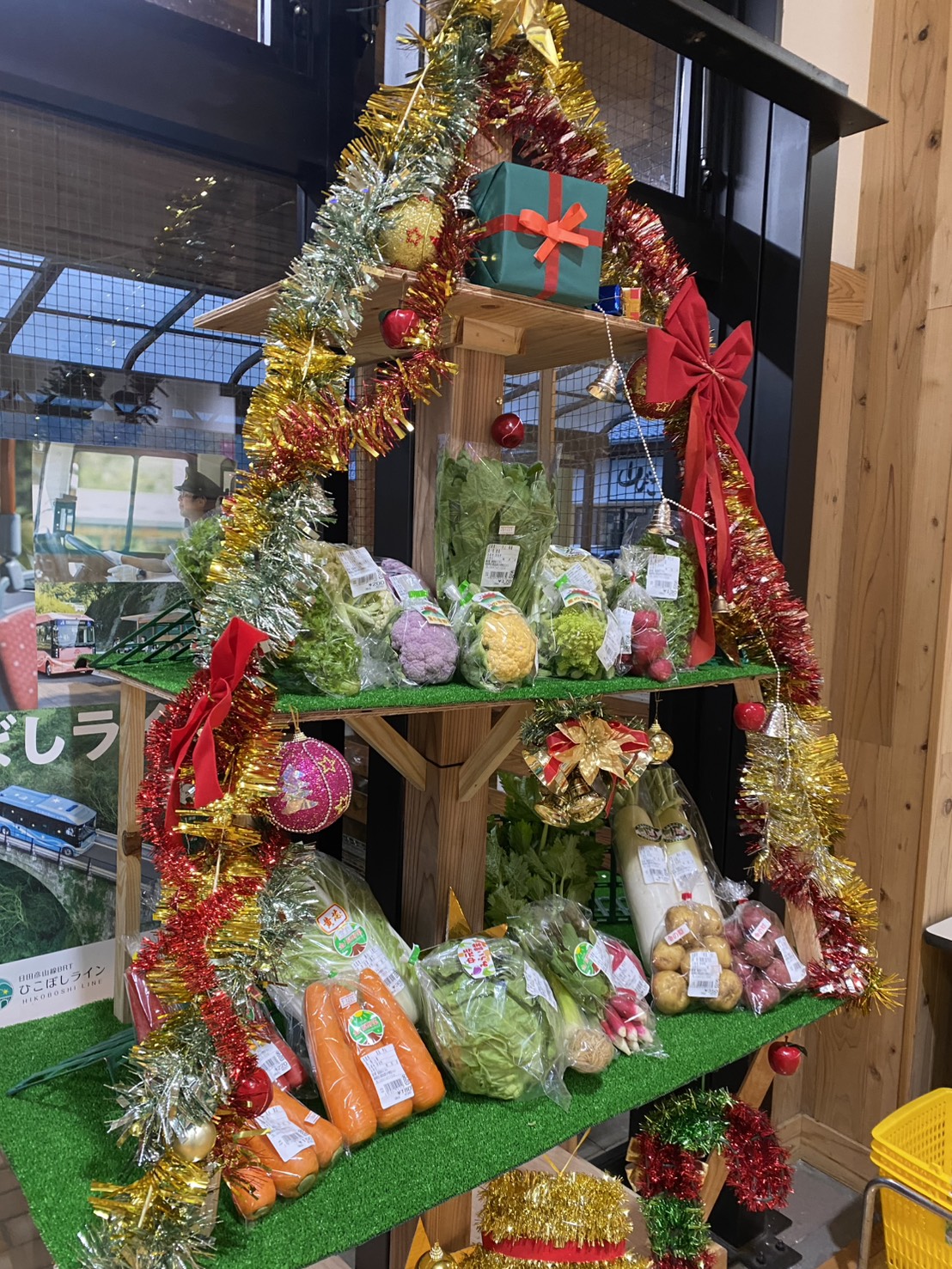 なんと装飾には物産館で販売している新鮮野菜を飾っています。